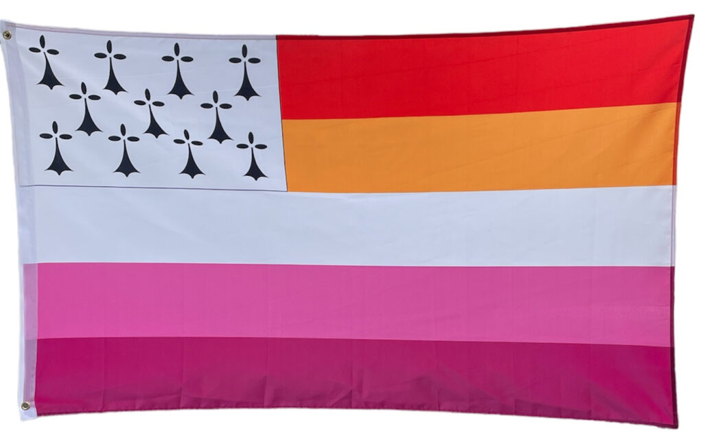 Drapeaux Lestons ou Gouine-ha-du (Breton Lesbien), Transton (Breton Trans) et Gayton Inclusif.